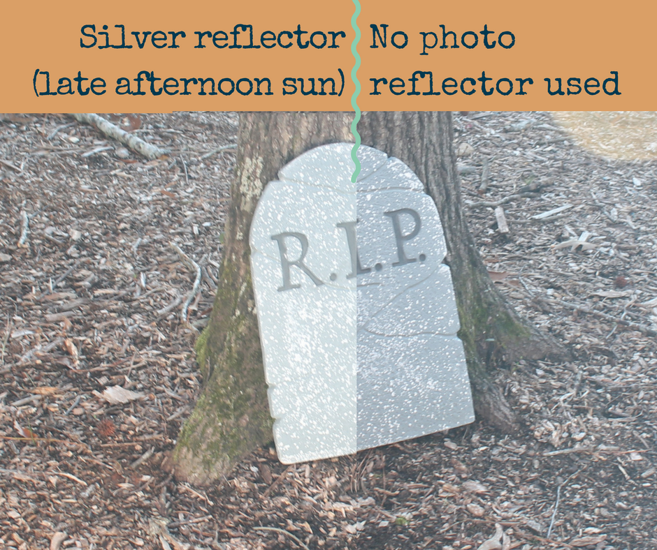 | This fake headstone doesn't have details that illustrate why reflected light is needed. It does show how much additional light the silver reflector can provide, even late in the day. |